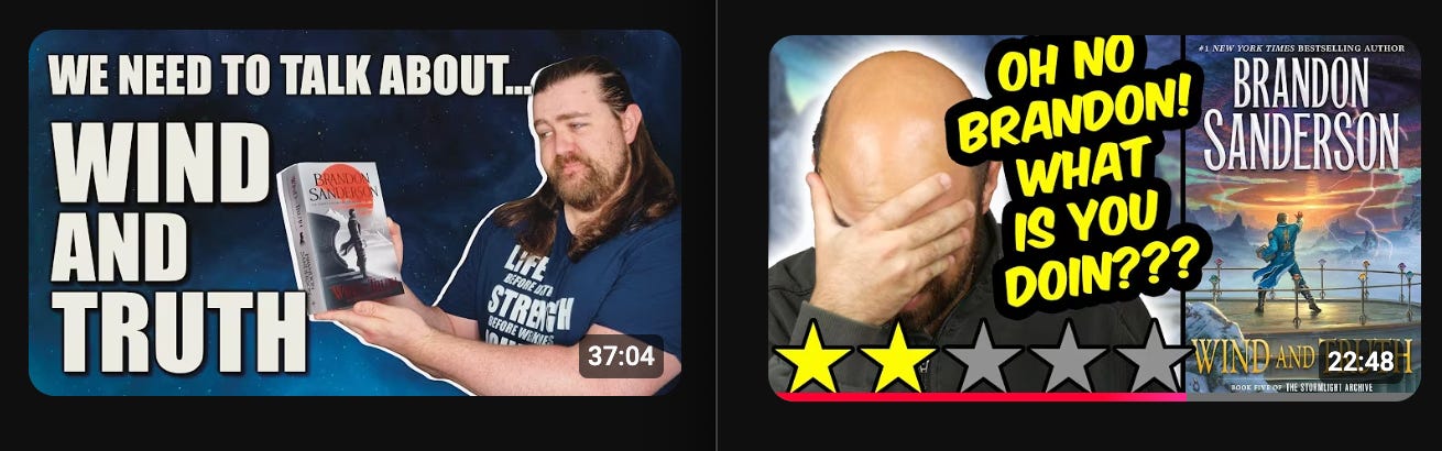 Worst (Best?) of all, it filled my Youtube feed with lots of Sanderson related content. Including numerous reviews of Wind and Truth. Most of which appeared to be negative. Common themes included humor that didn’t land, stilted prose, weird character choices, and a large emphasis on therapy.