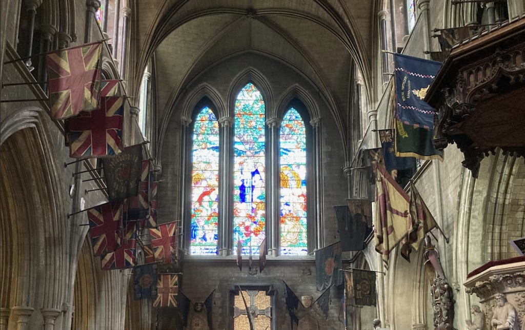 The northern transept of St. Patrick’s Cathedral in Dublin, which contains battle standards from previous wars in which the Irish fought.