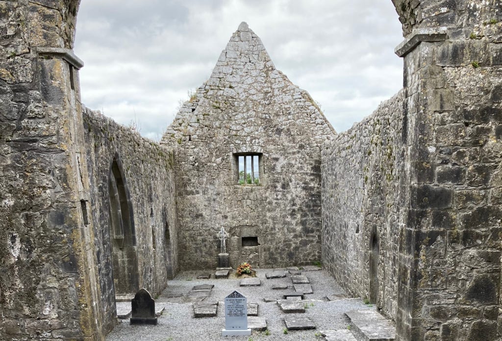 The ruined cathedral, or Teampuil Mor of Kilmacduagh Monastery in Ireland. The cathedral was built in the 15th century and is mostly intact except for the roof.