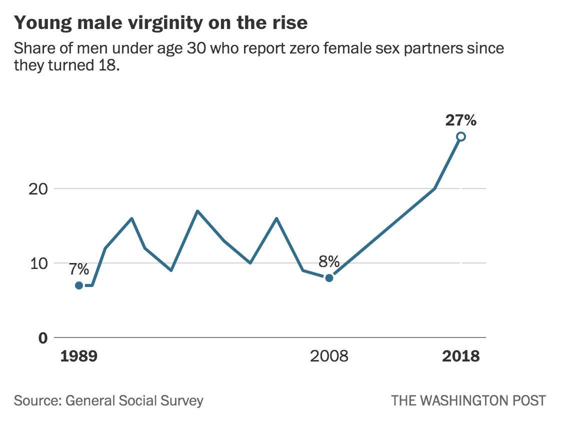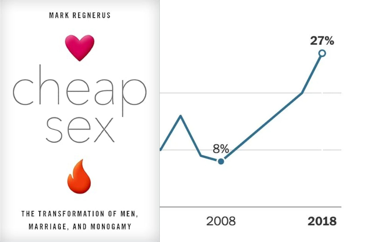 “Majority” is doing a lot of work in this excerpt. Yes, in the graph I posted 73% of men are not virgins, which is a majority. And I’m open to the idea that for those 73% sex is “cheaper” than it was historically. All this could be true and yet the increase in virginity from 8% to 27% over the course of ten years would still be a big story. A story that Regenerus largely ignores. But beyond that Regenerus claims that “cheaper sex should lead to more sexual relationships overall”. Which is not what ended up happening. Instead we’ve ended up in a sex recession.
