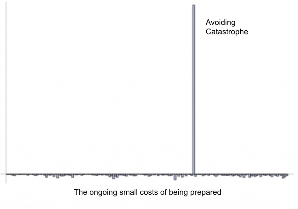 For fragility just flip the graph upside down. If we apply this to our current catastrophe the pandemic was preceded by thousands of small, fixed benefits, using the time and money we could have spent planning, preparing, and stockpiling, on other things. Things that presumably seemed more important at the time. But these small benefits turned into large costs when the pandemic arrived and revealed how fragile things really were.