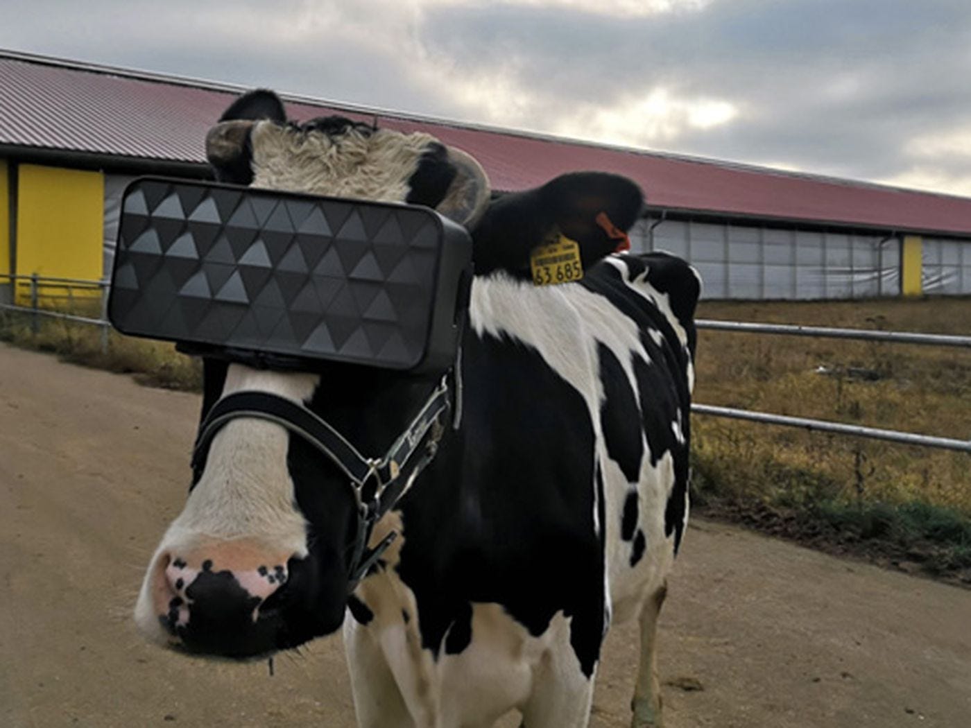 . It depicts:…the recent practice of fitting factory farmed cattle with VR headsets that simulate a grassy field, which reduces the animal’s anxiety and yields higher quality milk.