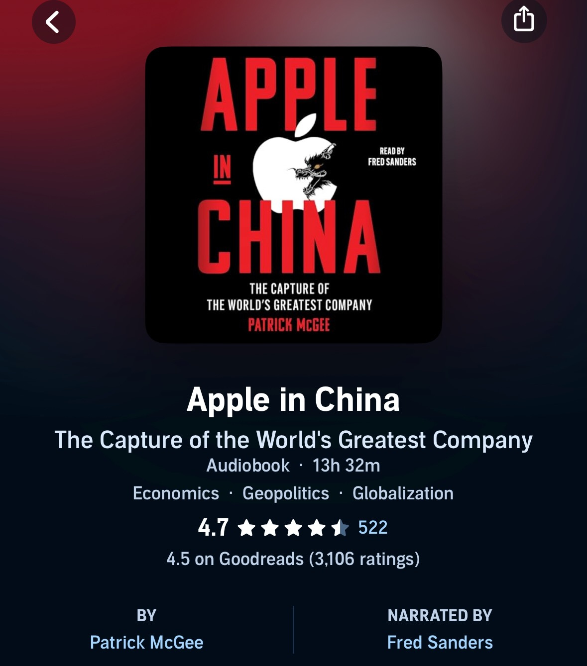 Another book that makes one nervous about the US losing its competition with China. But at least now we have a scapegoat: Apple!