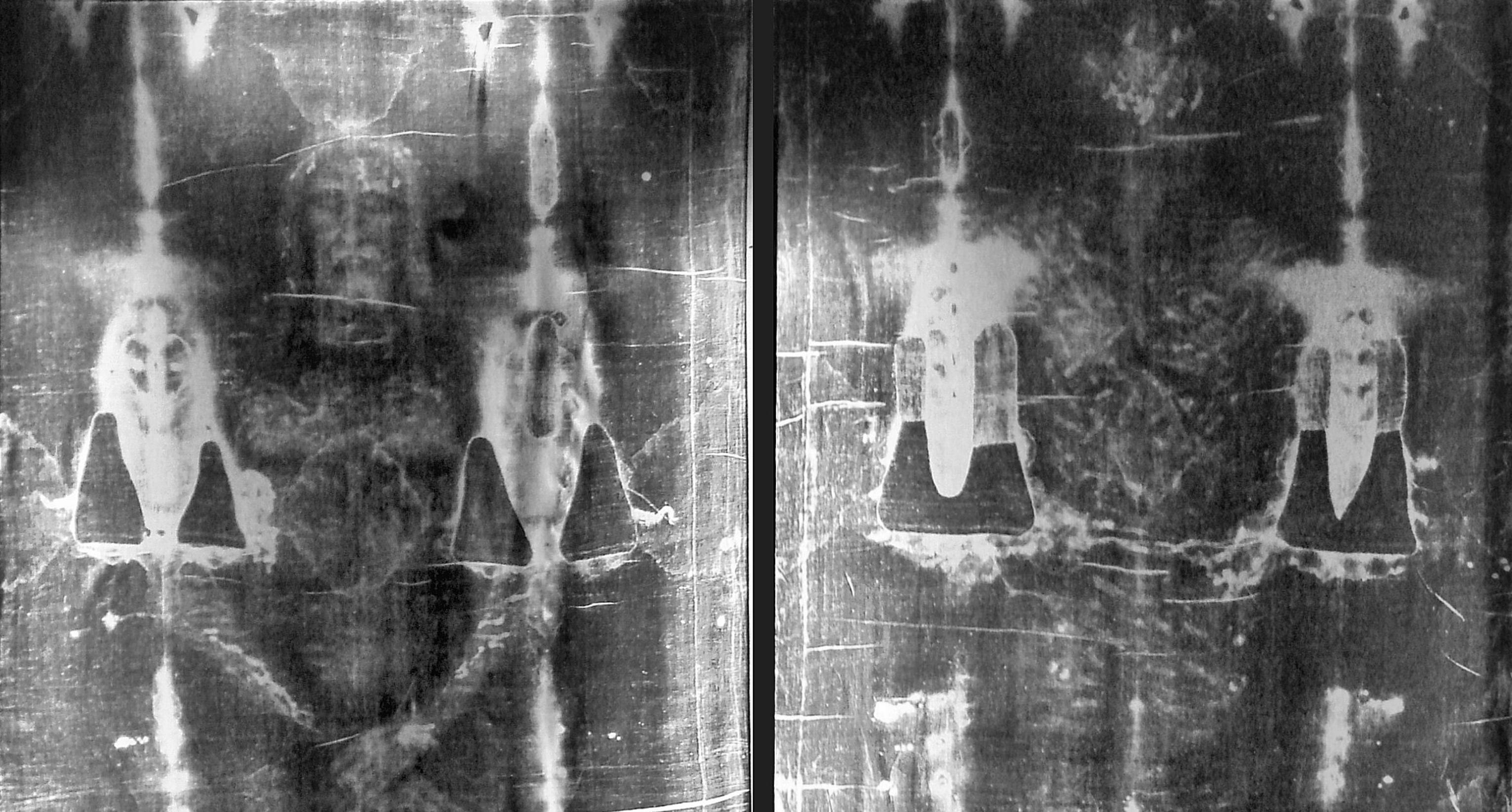 Photographic negative reveals a detailed crucifixion-like image (wounds, scourging, puncture wounds on scalp/forehead, wrist/feet holes, side wound). This isn’t obvious to the naked eye viewing the cloth normally.