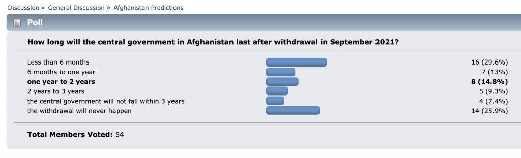 I first thought about this issue when I came across a poll on a forum I frequent, in which users were asked how long they thought the Afghan government would last. The options and results were: